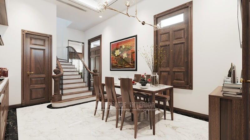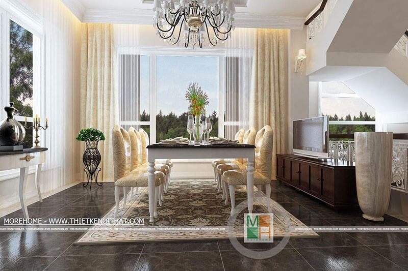 Lựa chọn lối thiết kế tân cổ điển tinh tế, tỉ mỉ, bàn ăn gỗ tự nhiên với những đường cong chạm trổ khéo léo để lại cho bất kì ai nhìn vào một không gian dùng bữa ấm áp mà đẳng cấp hơn cả