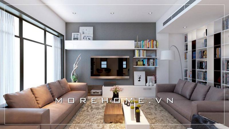 Phòng khách căn hộ chung cư trở nên gần gũi ấm cúng lại đẹp sang trọng với bộ sofa bọc vải màu xám tinh tế được thiết kế theo phong cách hiện đại kiểu văng ba tiện lợi.
