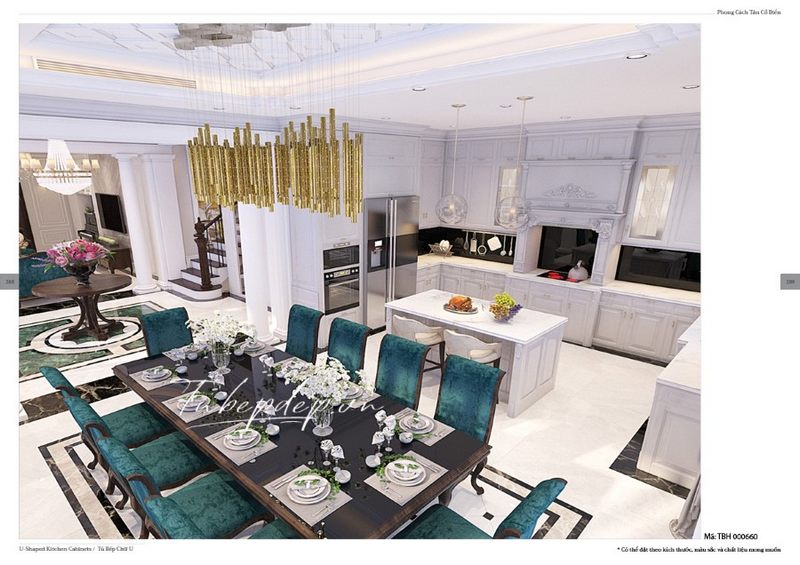Mẫu phòng ăn liền phòng bếp màu trắng đẹp ấn tượng có bàn đảo tiện lợi cùng với bộ bàn ghế lớn tân cổ điển cho biệt thự, nhà phố
