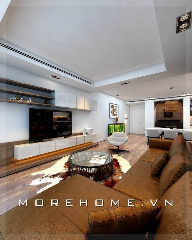 Ý tưởng bố trí không gian nội thất phòng khách sử dụng cách kết hợp 2 tone trắng, nâu thể hiện đối xứng, liền mạch trong từng gam màu đã tạo nên vẻ đẹp độc đáo, sáng tạo cho toàn bộ không gian chung cư