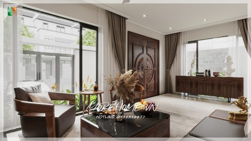 Phòng khách được bố trí hệ thống cửa kính cường lực cao cấp cho không gian phòng luôn thông thoáng