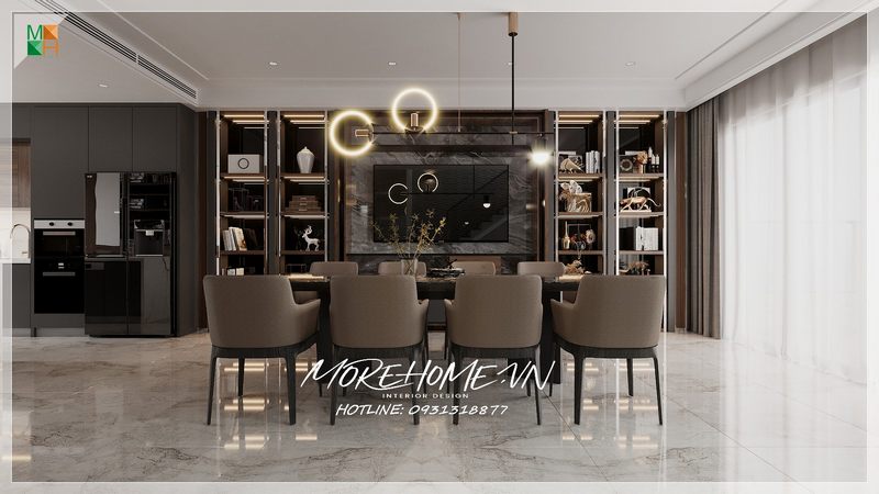 Tăng tính tiện nghi đem đến sự ấm cúng sang trọng cho phòng ăn, được lựa chọn các kệ tủ, kệ tivi âm tường hiện đại tối ưu được diện tích, bày trí đồ được gọn gàng ngăn nắp.