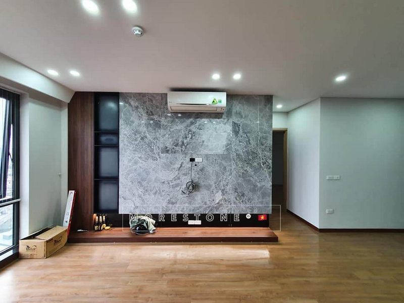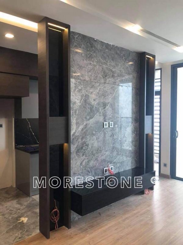 Tường phòng khách căn hộ chung cư thêm hiện đại, sang trọng khi sử dụng đá ốp tự nhiên sáng bóng với vân mây xám tinh tế được Morestone thi công.