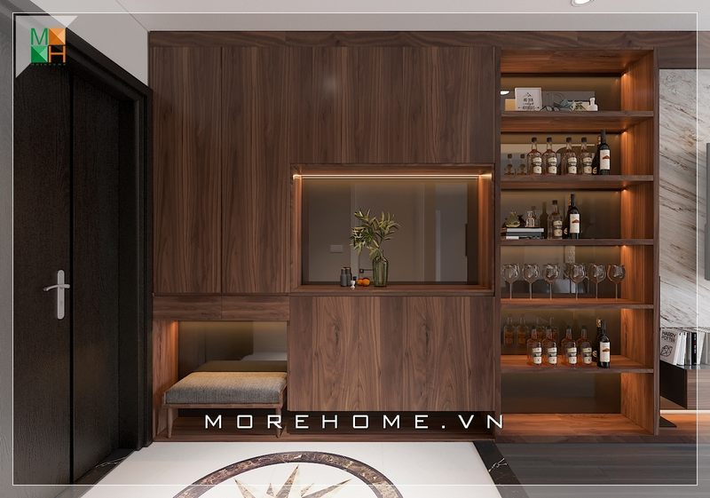 Mẫu kệ tủ rượu kết hợp kệ tủ giầy gỗ tự nhiên thiết kế full trần, cửa kính mang đến không gian phòng bếp sang trọng và đẳng cấp cho gia chủ
